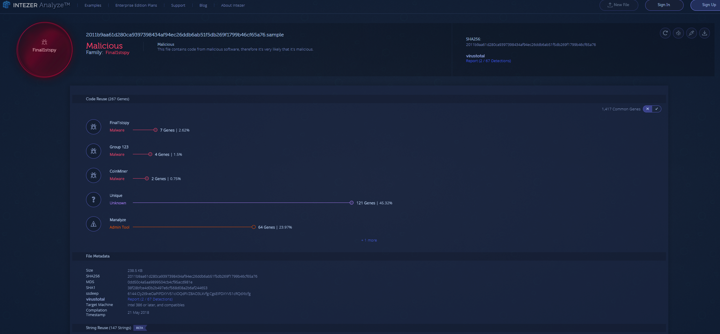 The DLL payload component under the hash that was listed in the report was not available on VirusTotal. We created some YARA signatures from the code of “LoadDll” and did a hunt via VirusTotal. Since the EXE component shares code with the DLL, the YARA hunt led us to find an earlier version of the DLL component of Final1stspy with 2/67 detections, compilation timestamp of May 21, 2018, and first upload to VirusTotal date of July 11, 2018. This is an earlier version than described in the Palo Alto report. After obtaining the hadowexecute DLL component, we checked to see if there was any code reuse in the Intezer Analyze™ system.