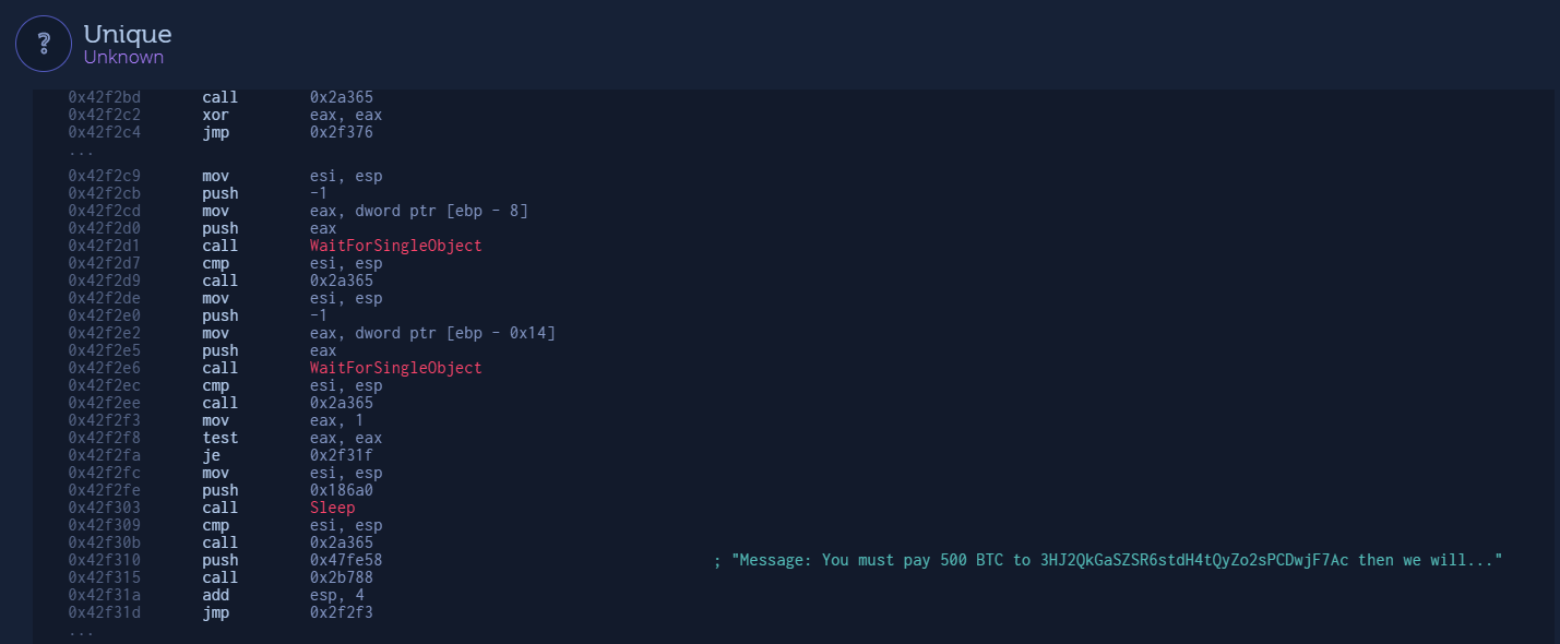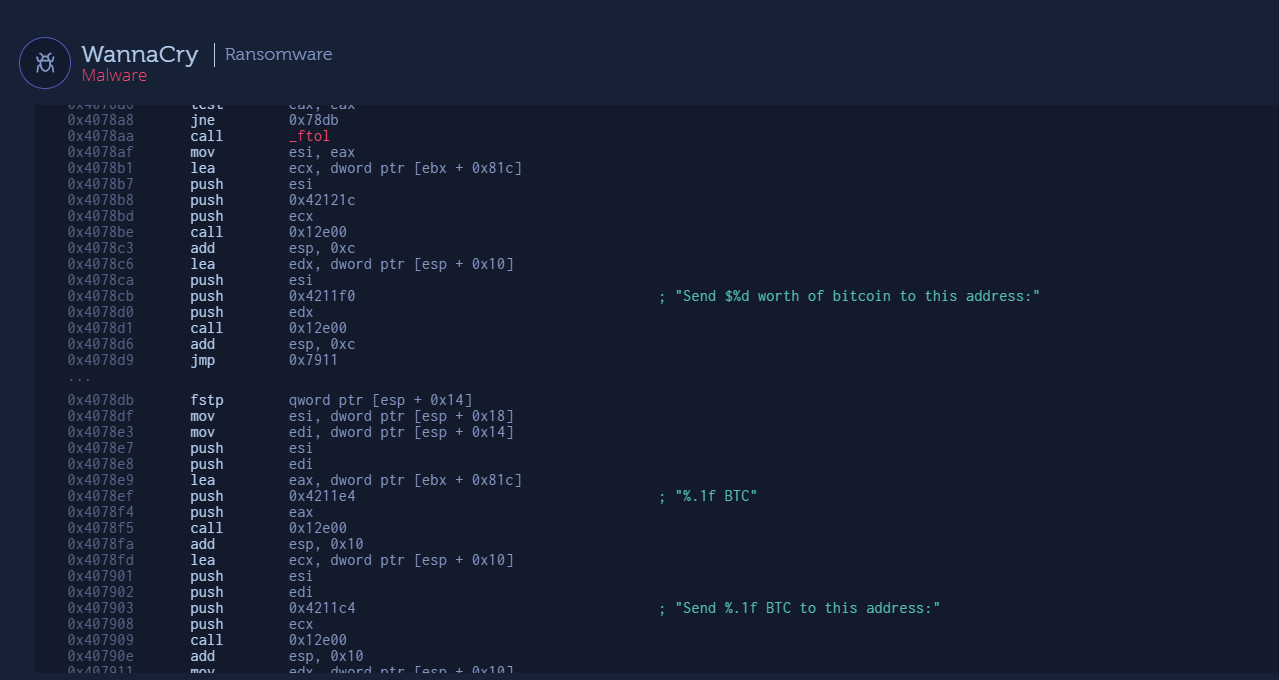 For example, in the figure below, you can see part of the Assembly code behind WannaCry. The addition of specific strings assists in understanding the code.