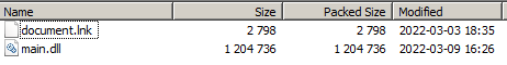 The ISO file includes two files, a LNK file named “document” and a DLL file named “main.” From the timestamps it can be concluded that the DLL file was prepared the day before while the LNK file was prepared about a week before. It is possible that the LNK file has been used in earlier phishing emails.