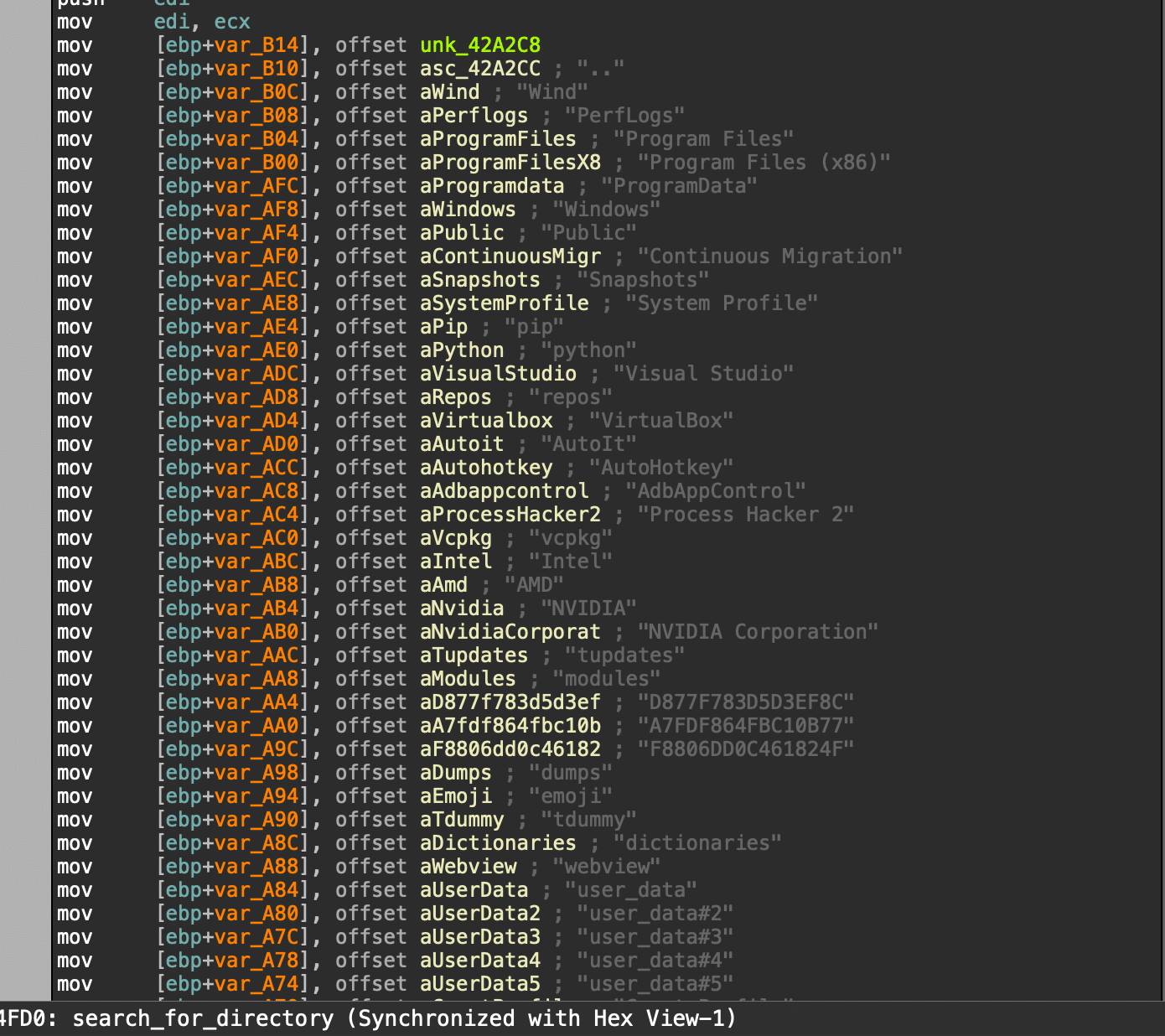 The stealer will start to iterate over each file. The file path is compared against a very large hard coded list of directories. The directories cover many categories, including programming, gaming, messaging, cloud storage, Office products, torrent, utilities, and antivirus.