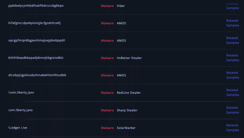 The strings share many overlaps with other stealers. This would be quite expected as competing malware developers would be able to see what folders or applications their competitors are targeting and add those paths to their own stealing mechanisms. YASS shares strings with Vidar, AMOS, ImBetter, RedLine, Sharp, Arkei, Atomic, and SolarMarker