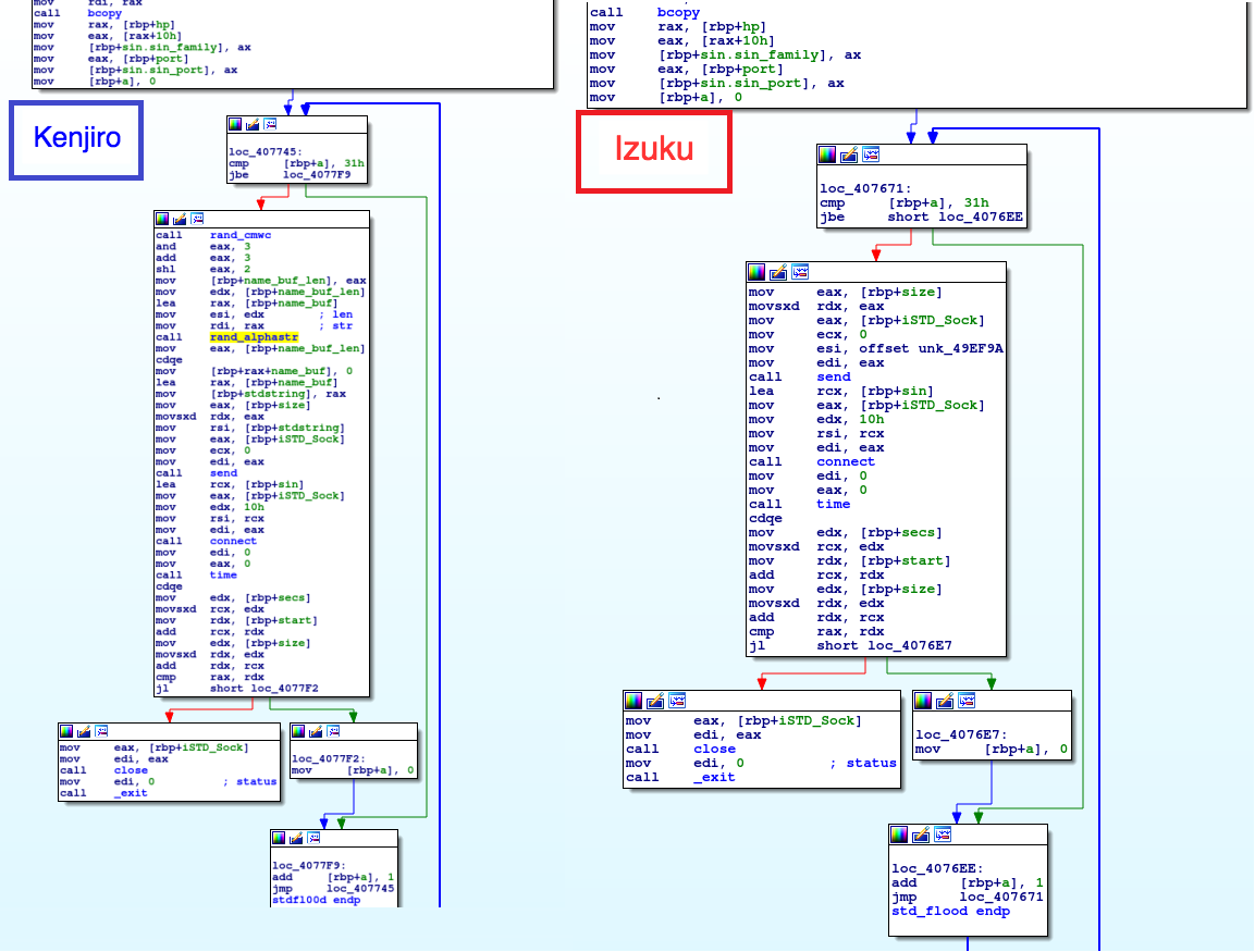 We decided to dive a bit deeper to see the small changes in the code. After further investigation, we could see Kenjiro seems to be an upgraded version of Izuku. One of the differences between Kenjiro and Izuku is that it changes its UDP flood algorithm to add some randomization to the buffer, where Izuku’s flood algorithm uses the same string.
