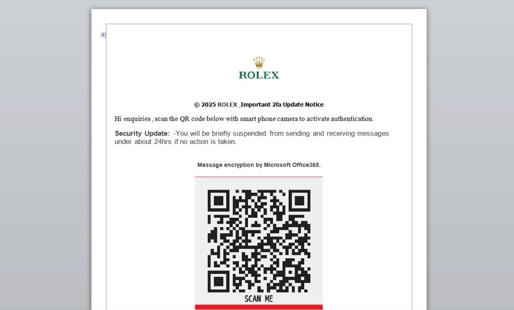 A malicious .docx sample contained an embedded MHT file delivering a sophisticated QR-based phishing attack (also known as quishing). The attack used multiple layers of deception: