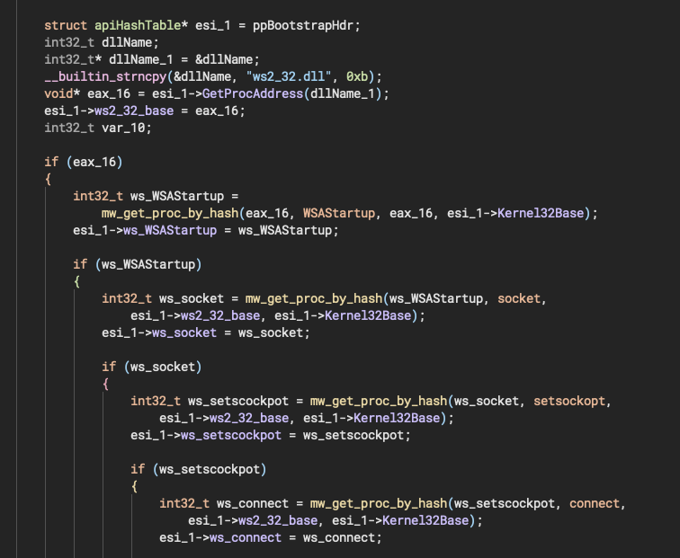 The malware uses a custom API-resolving scheme based on a simple rolling hash, applying it to module and function names instead of storing them in cleartext. This technique, previously analyzed in previous blogs, is a common evasion method seen in different malware types. With the HashDB project, resolving these hashes back to the original imported functions is straightforward, making analysis and detection easier.