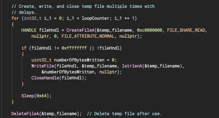 - Repeated file churn: creating, writing, closing, and deleting a temporary file in a loop with Sleep(100) delays, which burns execution time and stresses filesystem emulation.