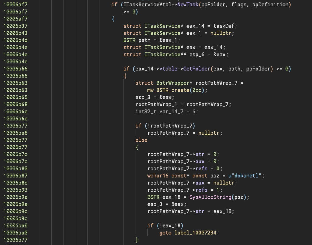 Once installed, it attempts to spin up the Task Scheduler COM service, connect to the local scheduler, open the root folder (“\”) and obtain an IRegisteredTask for a task named dokanctl. If the task doesn’t exist, it will create it using RegisterTaskDefinition. The task is set to execute every minute, it sets the execution path to the folder in AppData created earlier: %APPDATA%\<random-6-chars>\svchosts.exe, and sets it as the action Path. The task is registered in the root folder with the name dokanctl.