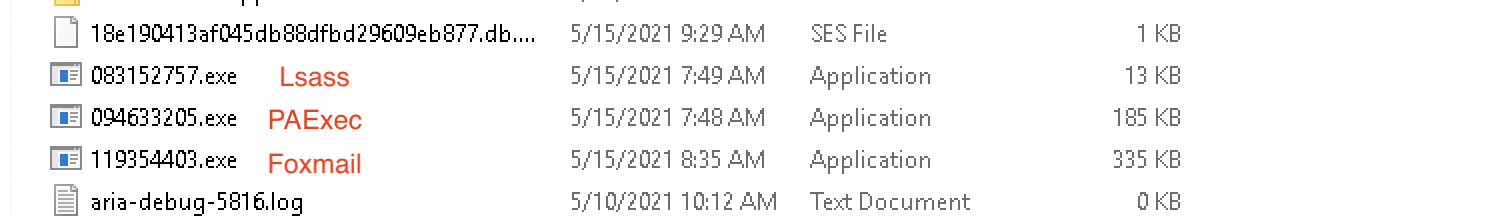 The malware will decompress and drop three Gzip embedded files into the %temp% directory. The dropped files are utilities for the threat actor to use once a C2 channel has been established. The files dropped are Foxmail, PAExec and LSASS, shown below.