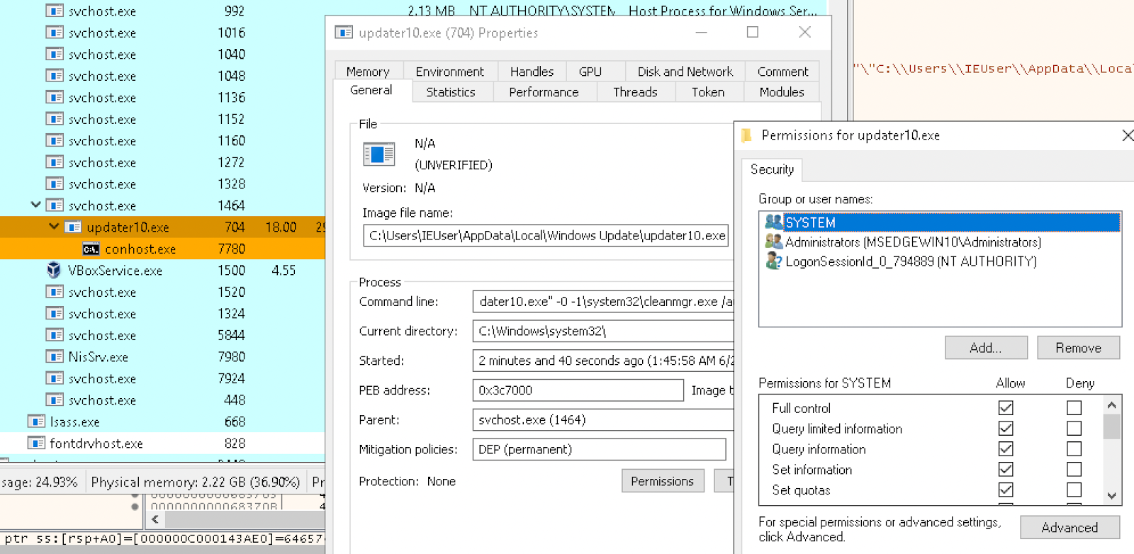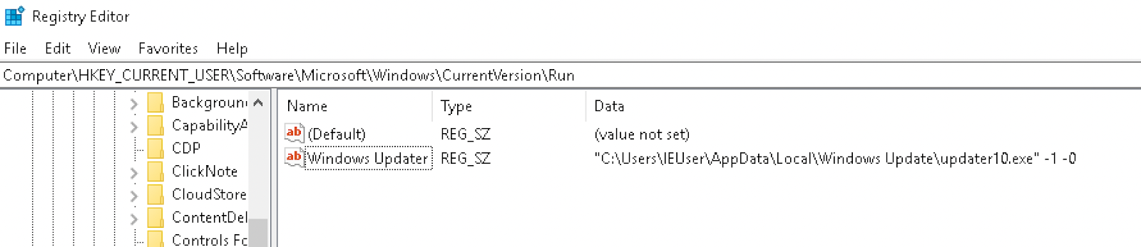 Next, the malware will check to see if it is installed at “C: UsersIEUserAppDataLocalWindows Updateupdater10.exe.” If not installed, the malware will be relocated to the path.