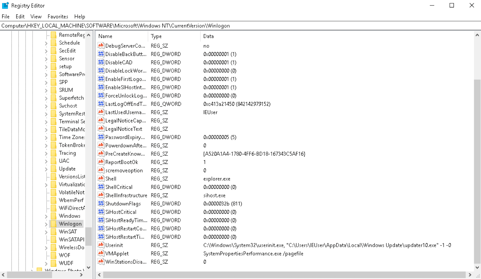 The malware can modify the “Winlogon” key in order to run itself during Windows logon. The path of the executable is appended to the “Userinit” entry.