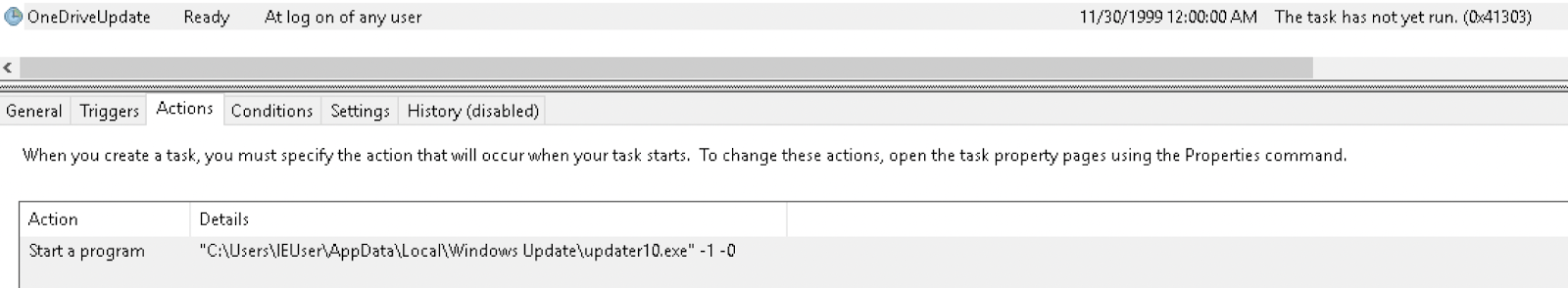 The malware can create a scheduled task called “OneDriveUpdate” to maintain persistence. The task is configured from an XML file, “elevator.xml” dropped to APPDATA, to trigger upon logon.