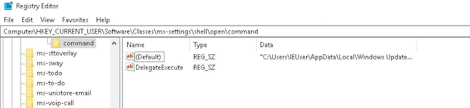 This exploit starts by opening the following registry key: HKEY_CURRENT_USER (0x80000001) SoftwareClassesms-settingsshellopencommand The default entry is set to the path of the malware, and an entry “DelegateExecute” has an empty string value added. Next, the program “computerdefaults.exe” is executed to complete the exploit.