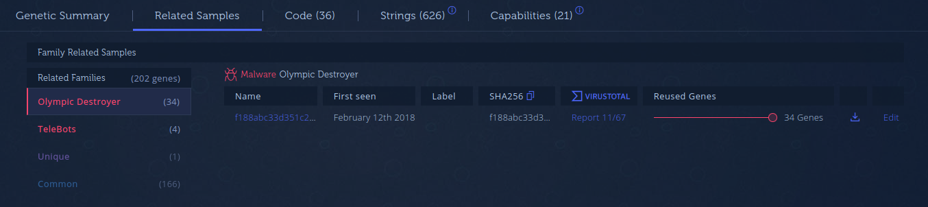 In biology, genes serve as the blueprint for proteins and the proteins affect what a cell will do. A parallel can be drawn to computer code. What a file will do, is dependent on its capability. The capabilities are “codified” in its code genes. What this means is that by connecting capabilities to code genes, we can detect that a capability is shared between different malware families, thus making a strong connection between them. To see this in action, let’s look at a practical example.