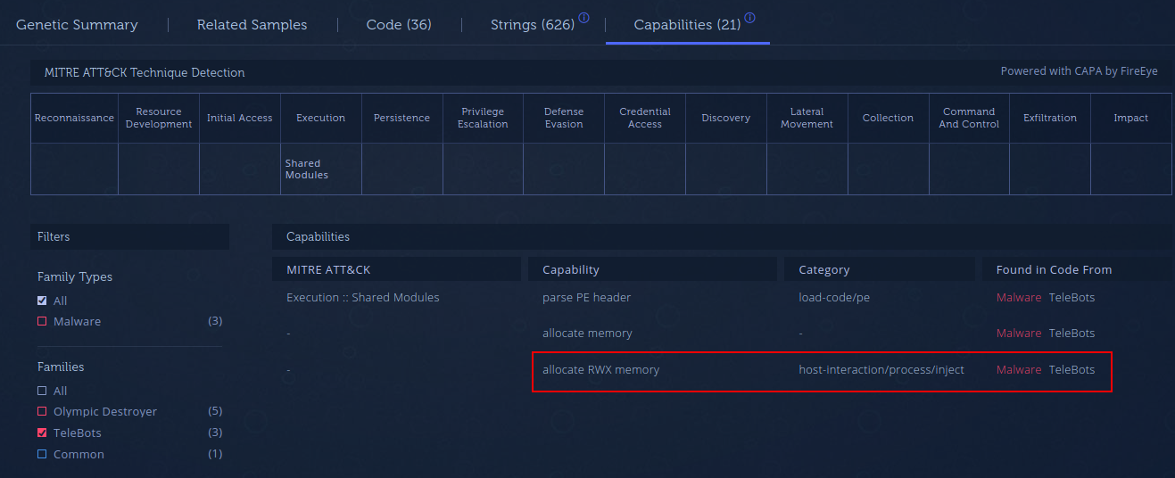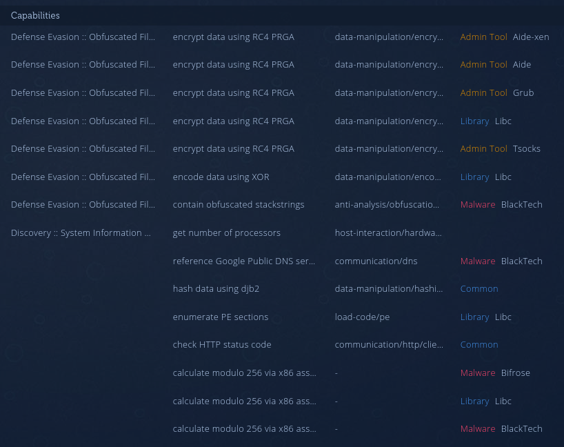 One beautiful marriage is the use of capabilities extracted by capa and malicious code reuse (aka code genes) detected by Intezer Analyze. At Intezer, we have a vast gene database of both known malicious code and code from trusted vendors. This allows for the detection of different malware versions but also detects when code is shared between different malware families. This can be used to attribute new malware to previously known threats. Another strength of code genes is that it allows for the determination of which functionality is shared between different malware via code reuse.