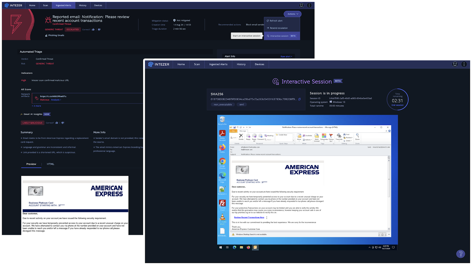 After initial triage, an analyst often needs to dive deeper into specific phishing alerts to fully understand the scope and intent of the attack. Intezer already allows users to interact with individual links and files, but this new capability now extends that interaction to the entire email itself in a secure, sandboxed environment. With a single click, analysts can open suspicious emails, explore embedded elements, and monitor behavior in real time, all without leaving the platform. This smooth transition from automated triage to in-depth analysis enriches investigations and maintains an efficient workflow.