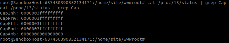 It’s a known bad practice to host containers with the ––privileged flag, or to grant them non-default capabilities, since this nullifies Docker’s security features. Seeing as Azure Functions’ core is its container, the first thing we did once we had execution over the Function was to check what capabilities our container had been granted. This can be achieved by reading a process’s status file in the /proc directory:
