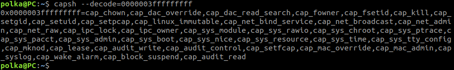 The Cap fields relate to a Linux capability mechanism. We won’t go into detail but decoding the Cap bitmap allows us to list the process’s capabilities, which all processes in the container share: