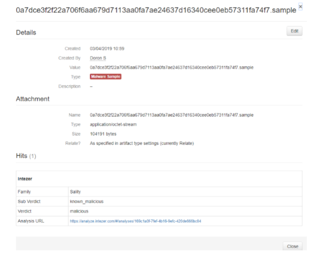 - IBM Resilient will query Intezer Analyze for scanning the submitted artifacts in order to provide additional information about the suspected file or hash.