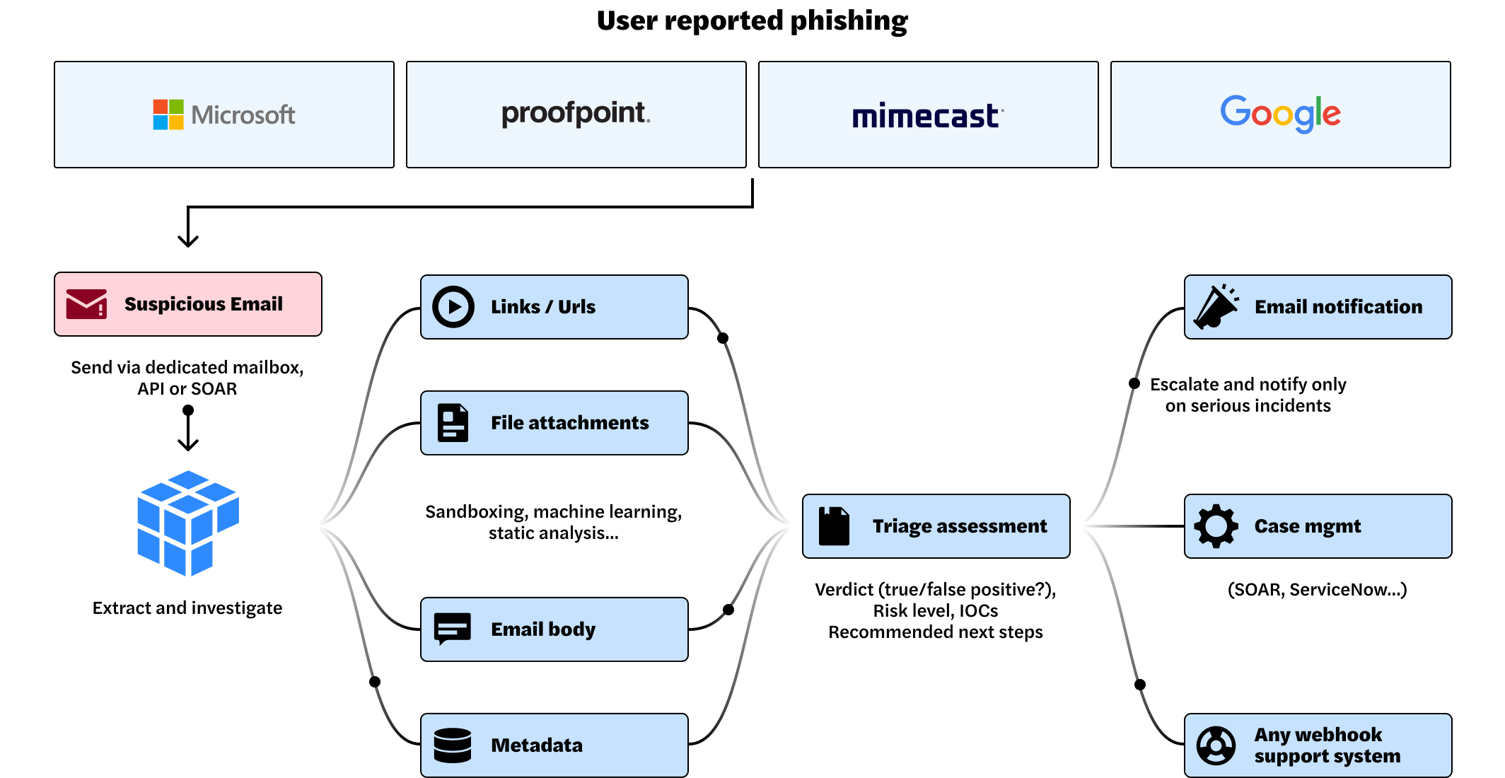 to integrate to your phishing inbox via SOAR, built-in plugins for Office 365 and Proofpoint, or with a simple forwarding rule.