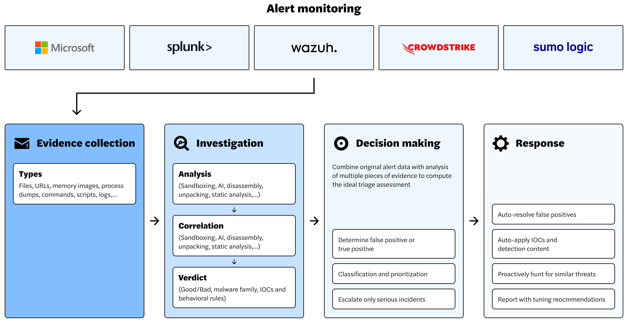 Applies proven, forensic analysis to validate real threats, dismiss false positives, and escalate only what requires human review.