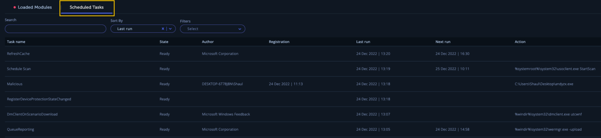 This tab provides information about all the registered scheduled tasks on the endpoint allowing you to find suspicious scheduled tasks that could have been registered by an attacker to achieve persistence. (Note: the Scheduled Tasks feature is supported only when using the scanner version v1.0.1.12 and above, so you want to make sure you’re using the updated version).