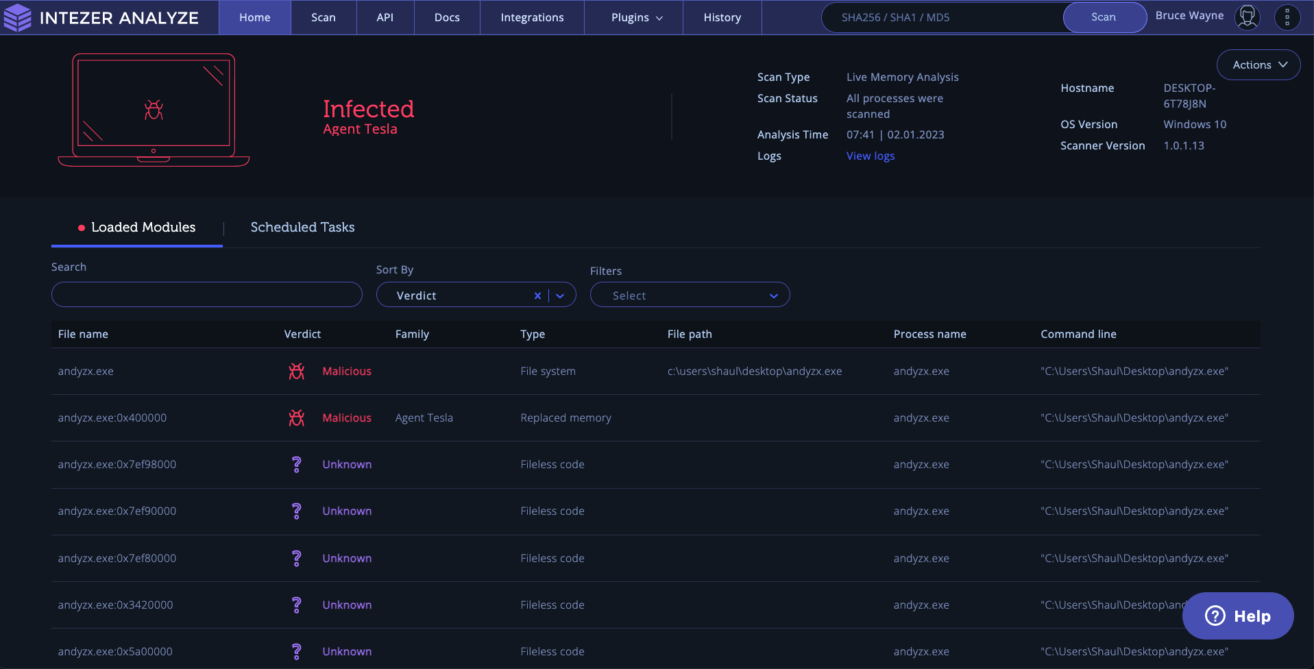 In this example, Intezer identified this machine was infected with Agent Tesla, as we can see from the classification on the top left: